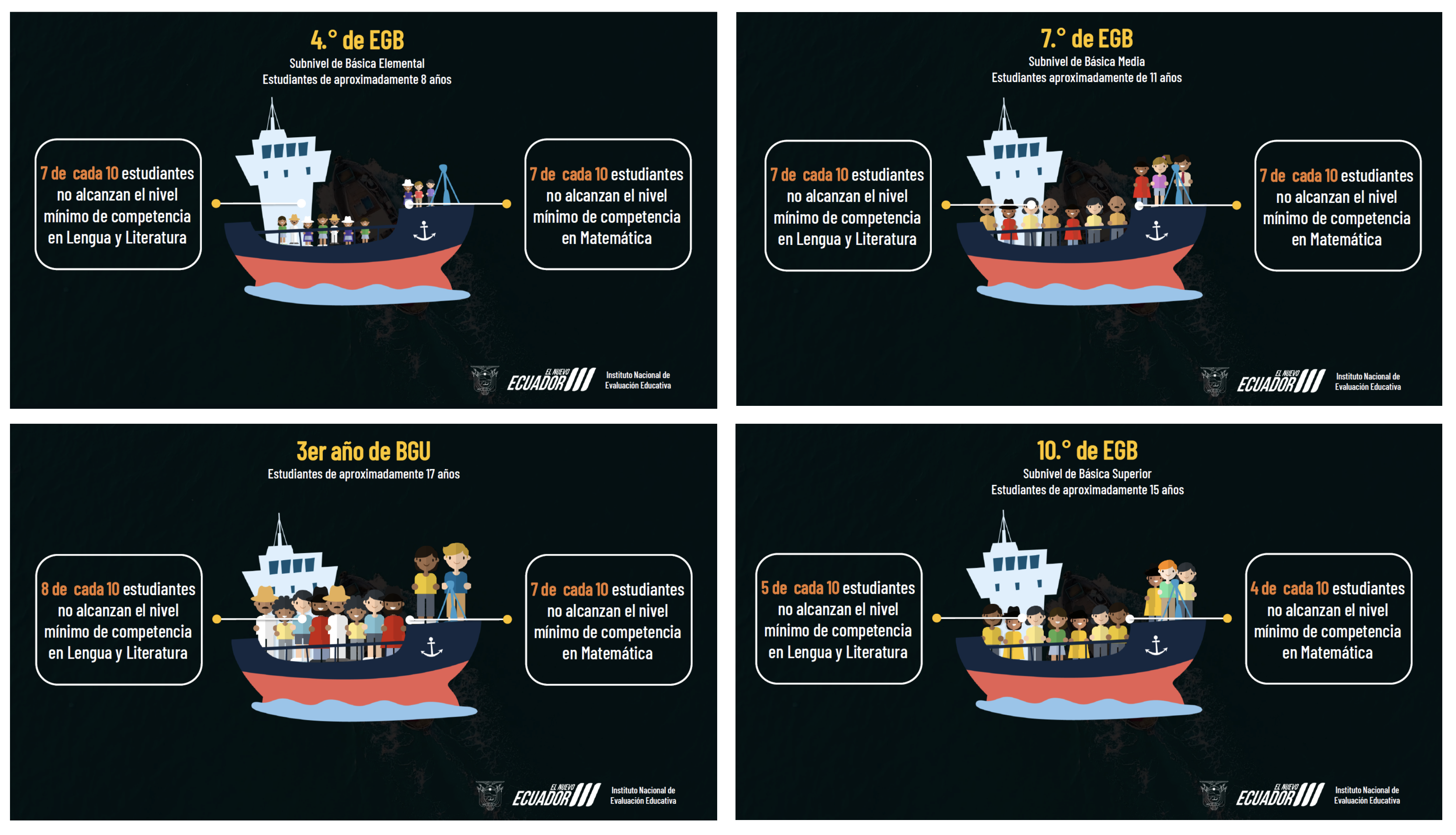 El 21 de febrero de 2024, el Instituto Nacional de Evaluación Educativa (Ineval) presentó los resultados de la evaluación Ser Estudiante 2023. Los resultados destacaron la mejora de los aprendizajes en las diversas áreas curriculares, respecto al año 2022. Sin embargo, hay que considerar la disminución en los puntajes en Ciencias Naturales, en los subniveles de básica Elemental y Media.